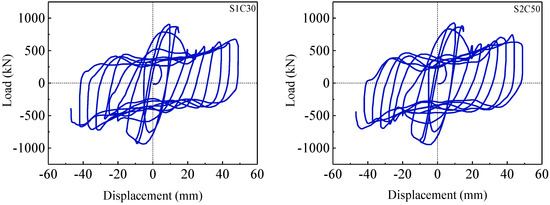 The counterforce fed back of loading points of the lateral loading device in the loading process can be obtained through MTS. The relationship between the counterforce and the displacement was plotted to obtain the hysteretic loops at the loading point of the steel plate shear wall with PEC columns, as shown in Figure 8.