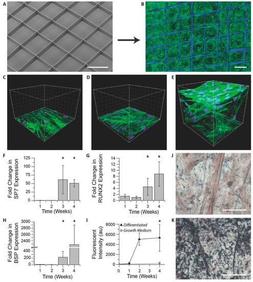 In vitro hMSC culture on 3D jet writing scaffolds produces 3D microtissues. (A,B) 3D microfiber scaffolds were incubated with fibronectin and seeded with hMSCs to yield confluent cell structures. (C–E) hMSCs cultured on scaffolds (E) reveal significantly different morphologies and spatial distribution (3D) than cultures on glass (C), or nonwoven PLGA fiber mats (D) (both 2D). (F–H) hMSCs on scaffolds were incubated in osteogenic differentiation media and monitored using qPRC. The markers SP7 (F), RUNX2 (G), and BSP (H) were used as indicators of osteogenic differentiation. Values reported are fold increases over hMSCs cultured in growth medium. Large increases in these markers after three weeks are consistent with the onset of osteogenesis. Error bars represent ± Std. Dev from three independent experiments. (I) Fluorescent staining of scaffolds for hydroxyapatite reveal substantial increases in matrix mineralization after two weeks of differentiation. (J,K) Von Kossa staining of hMSCs incubated in growth medium (J) show little matrix mineralization compared to that seen in samples differentiated in osteogenic induction medium indicated by the black aggregates (K). Scale bars represent: 500 µm (A,B); 50 µm (J,K); and the spacings between large grids are 20 µm (C–E). Reproduced with permission from [], Copyright WILEY-VCH Verlag GmbH & Co. KGaA, 2018.
