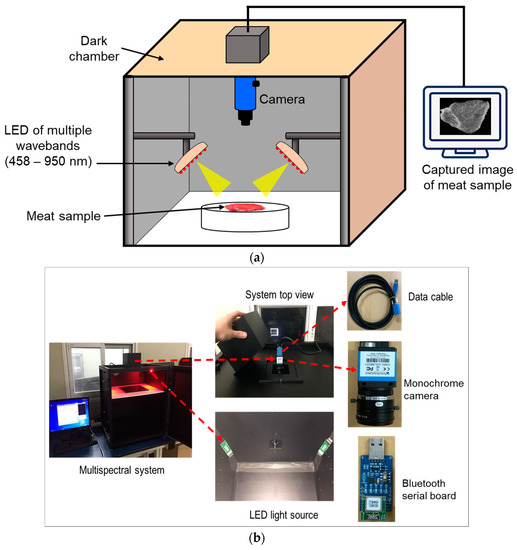 Schematic diagram (a) and photo (b) of the proposed multispectral imaging system for meat samples.