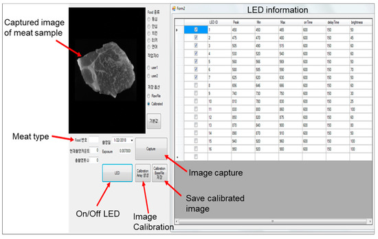 Equal-size meat samples were manually placed inside the dark chamber for the image acquisition, within the camera field of view (FOV). Before the image acquisition, the exposure time was set using a white Teflon tile with uniform reflectance. The system components and image-acquisition process were controlled by custom software created with the Microsoft Visual Basic environment under the Windows operating system (Figure 2). The software graphical user interface (GUI) included several options, e.g., image capture, camera calibration, LED information, image correction, image display, and save. To correct the captured raw images () of meat samples, a white reference image () was obtained with a Teflon sheet, while a dark reference image () was obtained with a lens cover. Further, the relative reflectance () was calculated as: