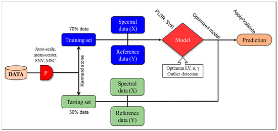 In this study, partial least-squares regression (PLSR) and support-vector regression (SVR) models were used to analyze the meat data. PLSR is the most frequently applied chemometric technique to predict the sample quality. It is an extension of the multiple linear regression model, which is widely used to specify the linear relationship between a dependent variable (Y-matrix) and independent variables (X-matrix) [12]. In this study, the independent variable was the spectral data obtained from the multispectral device, while the dependent variable was the chemical parameters (e.g., moisture, fat, and protein content) measured using conventional methods.