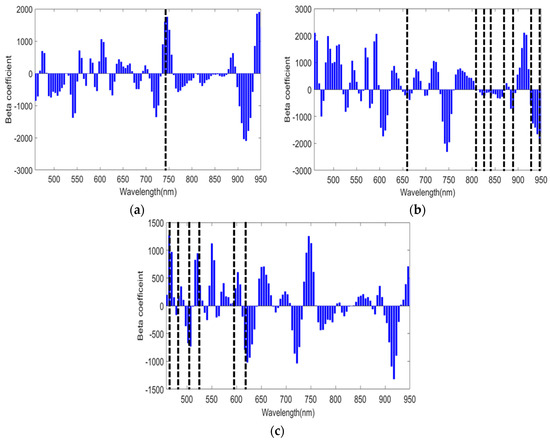 Selection of light-emitting diode (LED) wavebands using hyperspectral imaging (HSI) data based on beta coefficient plot. The selected wavebands were further used for multispectral system: (a) Selected regions for moisture content; (b) Selected regions for fat content; (c) Selected regions for protein contents. The dashed lines correspond to the central wavelengths.