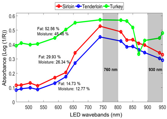 The region at 762 nm is the third overtone of the O−H stretching, which is linked to the presence of water; the region at 930 nm is the third overtone of the C−H stretching, linked to the presence of fat in the muscle of the meat [24]. In comparison with the tenderloin spectra, the turkey and sirloin samples showed higher spectral-absorbance intensity. This might be due to the presence of higher fat and moisture content in the samples. The fat and moisture values in the tenderloin samples were 14.73% and 12.77%, respectively, which were lower than the turkey and sirloin samples, showing lower spectral absorbance (Figure 5). However, the turkey spectra showed relatively higher optical reflection in the visible region of the spectrum due to the outside skin color.