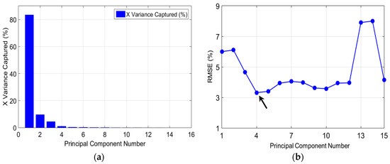 Example cross-validation method for optimizing a partial least squares (PLS) model: (a) Plot for the X-variance captured by the model; (b) Plot of latent variables (LVs) vs. root-mean-square error (RMSE) (the arrow indicates the optimized LVs with the lowest root-mean-square current (RMSC)).