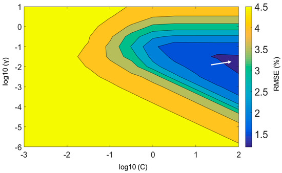 Counter-plot example obtained from the grid-searching method for optimizing the support-vector regression (SVR) parameters. The arrow indicates a finer grid with the lowest RMSE with the highest prediction.