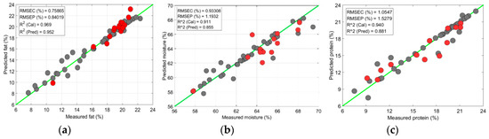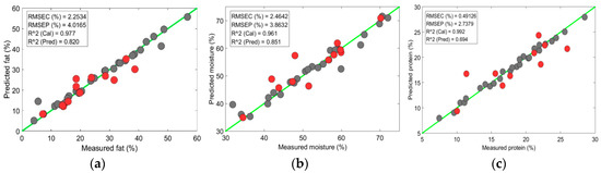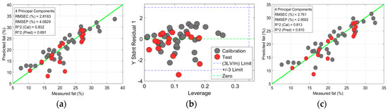 Once the parameters were optimized for both the PLSR and SVR models, the optimized parameters with the lowest RMSC were used to predict the chemical components of the meat samples. In this study, the prediction model for the meat data was also contaminated by the outliers; it was perhaps caused by a wrong system response, variability in the measurements, or experimental error. Therefore, identifying and excluding outliers from the data is significant, to prevent false data predictions. To detect outliers in the data, a widely used 3σ rule was applied, by removing values exceeding ±3σ [31,32]. Figure 8 presents an example of the outliers’ impact on the fat-prediction accuracy in the sirloin samples. For the fat prediction, the calibration data exhibited a strong correlation and a low error rate (: 0.83; RMSEC: 2.81%) between the measured and predicted values (Figure 8a). However, for the prediction data set, the correlation value decreased and the model error increased (: 0.69; RMSEC: 4.08%), due to the presence of outliers in the data. The outliers were identified by observing the leverage values against the standard residual values (Figure 8b), where some data surpassed the limit of ±3σ; they were considered outliers and excluded. After excluding outliers from the data, the prediction accuracy was improved with of 0.81 and RMSEC: 2.95% (Figure 8c). A similar method was used for outlier detection in the other samples and the best results are presented here.