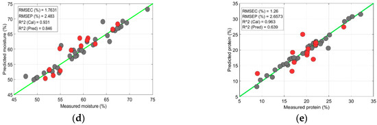Chemical-component prediction in a sirloin sample: (a) Prediction plot of fat content from partial least-squares regression (PLSR) model with outliers included; (b) Plot for outlier identification in fat data; (c) Prediction of fat content from PLSR model with outliers excluded; (d) Prediction of moisture content with SVR model; (e) Prediction of protein content with SVR model. The black dots are for calibration sample-set and red dots are for test-sample set.