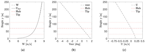 Used wind shears: (a) Streamwise velocity (W) for the case with wind veer and Horizontal velocity () corresponding to the streamwise velocity when no veer is used. (b) Wind veer of 2 degrees over the rotor. (c) Spanwise velocity (U) for the case with wind veer. The horizontal red lines (Hub and Tip) show the heights covered by the rotor area.