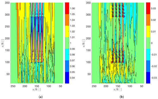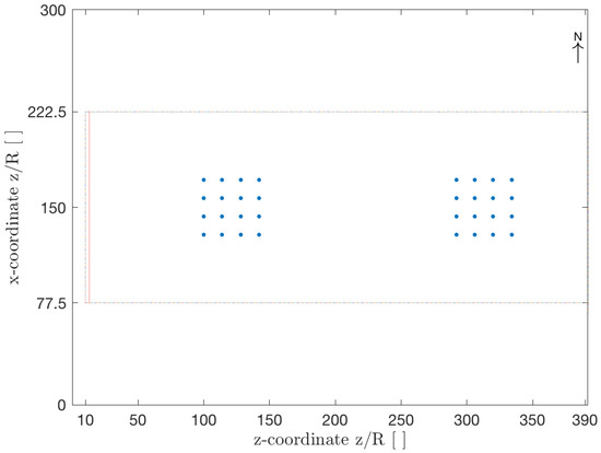 Two idealized wind farms of 4 × 4 wind turbines with an internal spacing of 14 R are considered, see Figure 4. The first wind farm’s front row turbines are placed at z = 100 R in the streamwise direction and are centered around x = 150 R in the spanwise direction. The total domain has the extensions 300 R × 392 R × 25 R in the x, z respectively y directions. The inner equidistant region covers the x-coordinates 150 ± 72.5 R, the z-coordinates 10–392 R and has a height of 8 R. The extension of the equidistant region covers in the z-direction the second wind farm that starts at 292 R, which corresponds to 150 R (6 km) behind the first wind farm.