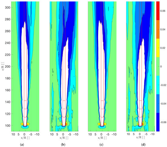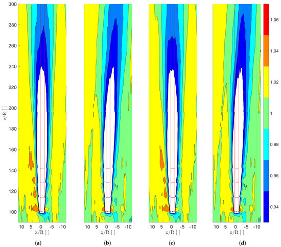 Figure 1a–c provide information for the cases. Figure 1a shows the total horizontal velocity together with the corresponding streamwise component W when a linear wind veer of 2 degrees over the rotor is considered, as shown in Figure 1b. Figure 1c shows the spanwise velocity U corresponding to this case. For the former case where no wind veer is considered, U is the same as in Figure 1.