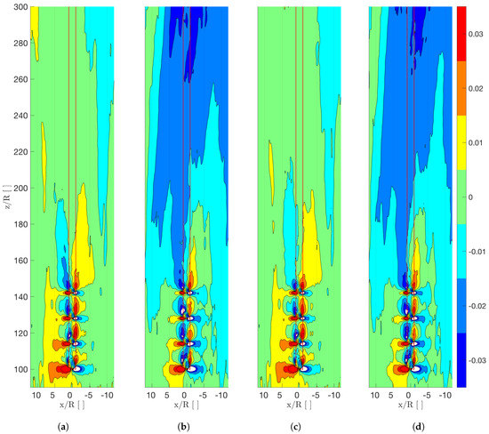 Streamwise velocity (W) at hub height (see colorbar) with the background flow removed, for a row of turbines for cases: (a) ws (b) veer (c) ws cor (d) veer cor.