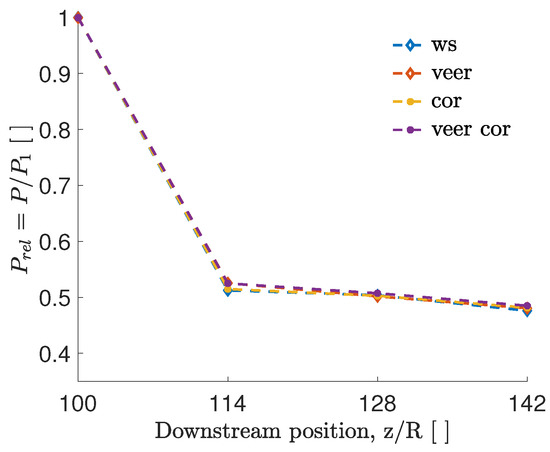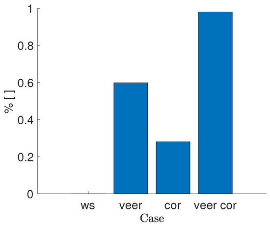 The relative production in Figure 10 shows a slightly faster recovery for turbine number two when including the wind veer and for turbine number four a slightly higher production value when including the Coriolis correction. The overall percental change in production for the whole row can be seen in Figure 11. Including both the wind veer and Coriolis correction increases the production by 1% compared to case ws. Looking at the individual impact of including either the wind veer or the Coriolis correction, it can be seen that the largest impact on the total production comes from the former.
