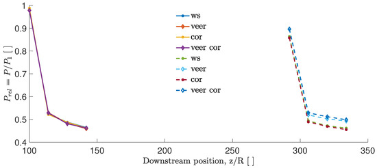 The incoming neutral atmospheric boundary layer, which can also include a wind veer, is mimicked by using a FBL technique that uses body forces [11] to introduce the wind shear in the NS-equations, Equation (1). The body forces are calculated iteratively inspired by the immersed boundary technique in a prestep to reach the desired wind profile in the domain. In the main simulations these forces are applied in the whole domain to maintain the incoming wind shear in the whole domain. Varying body forces are similarly used to add a realistic atmospheric turbulence from the Mann model [21,22] as planes inside the equidistant region. The used method to impose the wind shear and the turbulence inside the domain has a number of advantages compared to the use of an initial flow condition and variations at the inlet boundaries [11]. Among others the applied wind shear is a solution to the NS-equations and the turbulence plane allows for a stretched region in the inlet of the domain which saves grid points for the equidistant region of interest (where the analysis are performed).