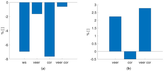 Looking at the relative production in more detail for the second wind farm compared to the first wind farm, see Figure 14a, it can be seen that with wind veer the relative loss in production for the second wind farm is less than 2% compared to around 7% for case ws. The impact from the considered Coriolis correction is smaller but in combination with wind veer it decreases the losses. The change in relative production for both wind farms compared to case ws can be seen in Figure 14b. When including the wind veer and Coriolis correction a total increase of around 3% can be seen compared to case ws for this full wake direction.