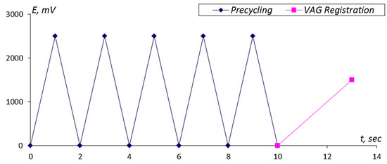- Registration of the VAG curve in the analyzed solution at a potential scan rate of 0.5 V/s in the range of potentials from 0–1.5 V.