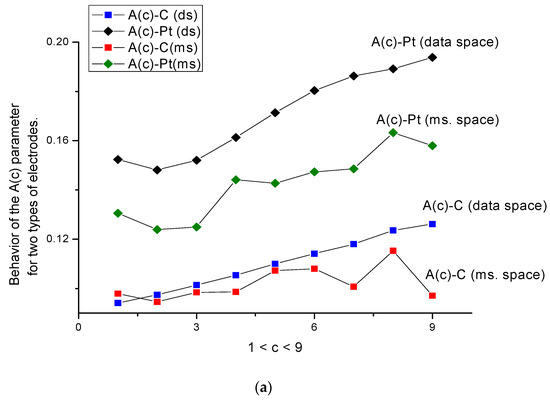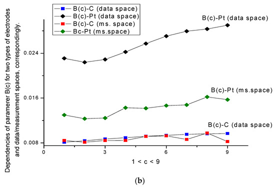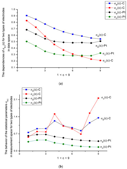 - The parameters analyzed above reflect the specificity of electrode processes from different points of view. For the more active C-electrode, which has better oxidation characteristics, many output DGI parameters changed more intensively in comparison with the more inertial Pt-electrode. The Pt-electrode is more stable in oxidation processes. Being a more “stable” material with respect to the transfer electron process related to the oxidation of amino acids, it requires the calculation of an extended set of “fine” parameters that are sensitive to concentration variations of the electroactive substance. For the given case, we associate these variations with the behavior of parameter σB,C. As it follows from the analysis of Figure 7a, these parameters have monotone and decreasing characteristics against the concentration in data space. In the measurement space shown in Figure 7b, these parameters characterize again the electroactivity of the C-electrode, which has variable characteristics, compared to the relatively stable behavior of the Pt-electrode. Again, the 300-cycle boundary is conserved. Only after this limit does the Pt-electrode tend to the aging regime.