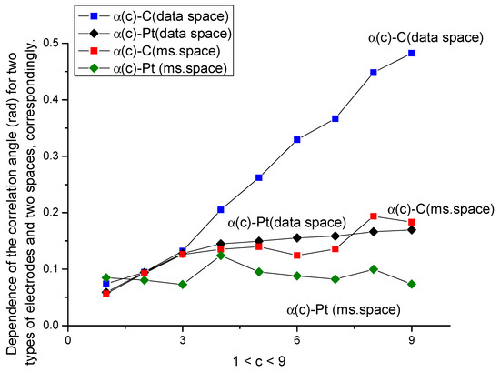 - In data space, the dispersion curves Dsp for C- and Pt-electrodes differ by their mutual location with respect to each other; the value Dsp(c) (C-electrode) exceeds the curve Dsp(c) (Pt-electrode) for all values of c. The gravity ratios Rt(c) for both types of electrodes are strongly deviated from each other as well.
