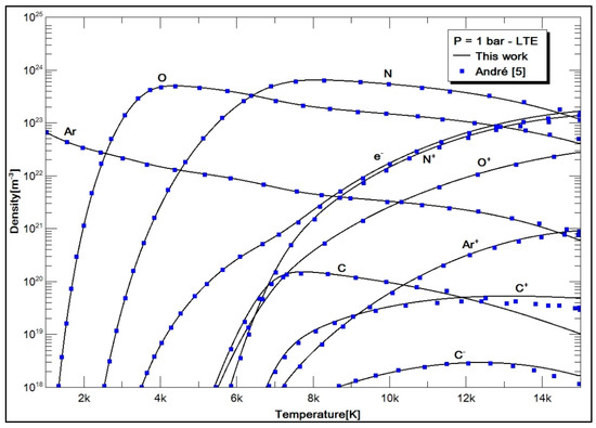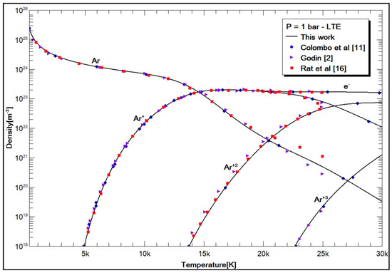 In this work, to calculate the plasma composition, we used the mass action law (Equation (6)) with the method proposed by Godin [2,3]. This method is a generalization of the Saha and Guldberg–Waage laws, and enables a fast solution for the system of equations.