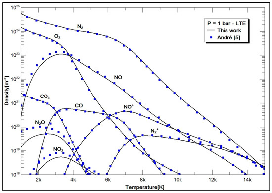 In the literature, three methods are mainly used to calculate the evolution of species densities with temperature and pressure in thermal plasmas: the Gibbs free enthalpy minimization [1], the mass action law method [2,3], and the collisional radiative model. Based on these methods, numerous papers have reported chemical plasma compositions for pure gases and mixtures, with or without the LTE assumption [2,4,5,6,7,8,9,10,11,12,13,14,15,16].