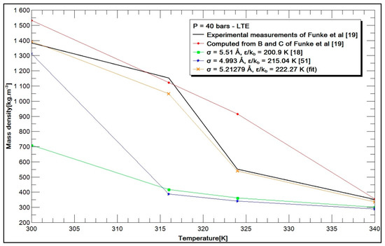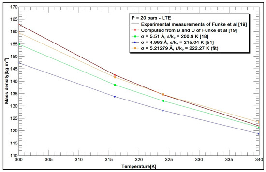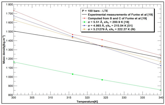 The mass densities obtained from the optimization process are the closest to the experimental ones. The mass densities obtained from the other sources from the literature are sometimes in good agreement below the critical point, and sometimes agree at values over the critical point, but not over the full range of temperature and pressure. By using the optimized data (fit), the relative errors of the experimental values did not exceed 9%. Thus, when experimental data for the mass densities are available, obtaining σ and with the optimized software is preferable. This dataset σ = 5.21279 Å and = 222.27 K gives a better approximation of the calculated mass densities for a pressure range of between 1 and 300 bar. The use of the Stiel [51] formulation is a good option for pressures and temperatures that are not too close to the critical point Pc ≈ 37.5 bar and Tc ≈ 318.8 K (cf. Figure 4 and Figure 6), when no other data are available. The curves from Figure 4, Figure 5 and Figure 6 show discrepancies in the variation of the LJ potential parameters on the mass densities deduced from the composition. It should be underlined that a dataset for σ and , obtained from the experimental measurements for the given values of temperature and pressure, cannot be used without care over the whole pressure range.