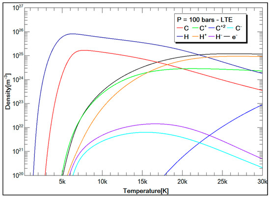 Atomic species for CH4 plasma densities at P = 100 bar − LTE.
