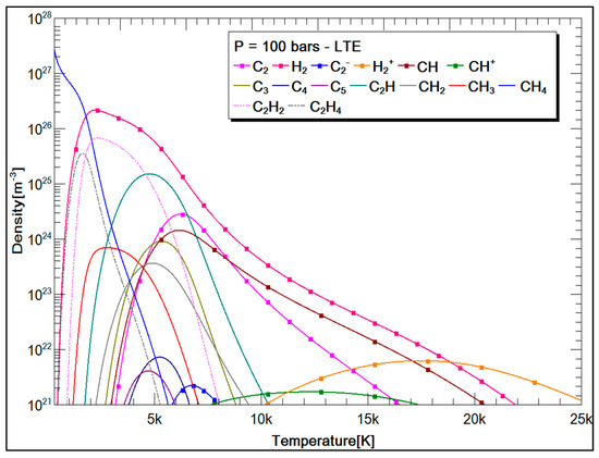 Molecular species for CH4 plasma densities at P = 100 bar − LTE.