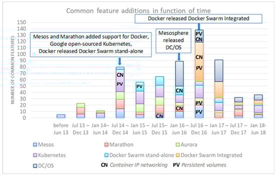 However, there have been several high paces of feature additions among the most popular CO frameworks as illustrated by Figure 1, which shows the number of feature additions between June 2013 and June 2018. As shown, there was a first peak of feature additions between June 2014 and January 2015 because Mesos v0.20.0 [7] added support for Docker containers and Google open-sourced Kubernetes v0.4.0 [8] that from its inception offered support for Docker containers. Moreover, Kubernetes v0.6.0 included several innovating features such as container IP and service IP networking [9], pods [10], and persistent volumes [11]. This caused a ripple effect of feature additions across the other CO frameworks. For example, support for persistent volumes has been added to Docker v1.7 [12] in June 2015. By August 2016, Docker’s architecture for persistent volumes has also been supported by Mesos v1.0.0 [13]. As another example, support for container IP networking has been added to Mesos v0.25.0 [14] and Docker Swarm stand-alone v1.0.0 [15] by January 2016.