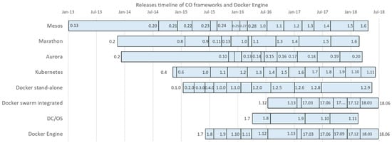 Timeline of when successive versions of container orchestration (CO) frameworks have been released (until September 2018).