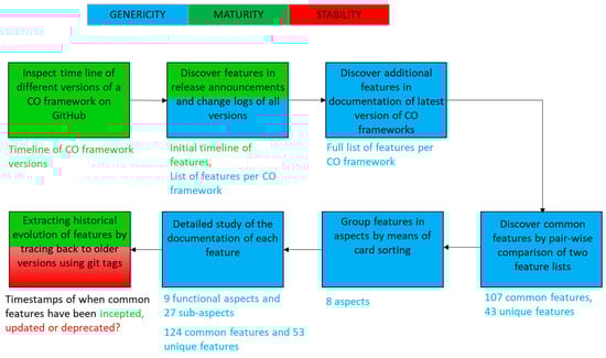 The following six subsections explain our method for (1) the qualitative assessment and (2) the quantitative analysis with respect to the genericity property—using the data collected in the blue bar of Figure 3, (3) the qualitative assessment of maturity using the data in the green bar, (4) the quality assessment of stability using the data in the red bar. We also explain (5) how we have gathered feedback from industry to improve the coherency and correctness of the collected data and (6) how we have dealt with the continuous evolution of the CO frameworks during the course of the research work.