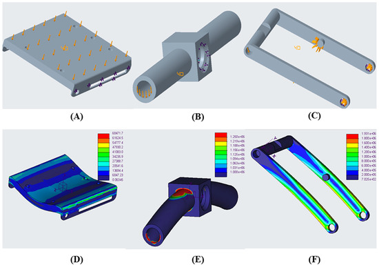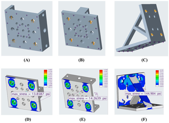 (A) 100 N load applied to the 4 × 4-in lab scissors jack platform by FEA analysis. (B) 100 N load applied to the 4 in × 4 in lab scissors jack short rod by FEA analysis on both edges of the hole. (C) 100 N load applied to the 4 × 4-in jack scissor by FEA analysis on the surface of end holes, extrudes and edges on front holes. (D) FEA result of 4 × 4-in laboratory scissors jack platform with maximum stress of 68471 psi. (E) FEA result short rod with maximum stress of . (F) FEA result of scissors with maximum stress of .