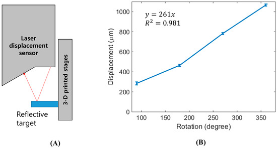 Figure 3 and Table 1 displays the measurement results from the laser displacement sensor when the linear stage was translated by rotating the knob by 90° at each step. A complete revolution provides approximately 1080 m of maximum stroke with a slope of approximately 3 m per degree of rotation. The standard deviation for each quarter revolution was approximately 9–14 m, which is a 1 to 5% coefficient of variation (CV).