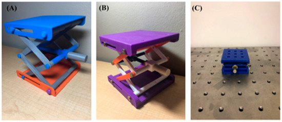A variety of 3-D-printed laboratory scissor jacks. (A) Photograph of 4 × 4-in 3-D printed laboratory scissors jack. (B) Photograph of 4 × 4-in 3-D printed laboratory scissors jack with metal screws, threaded insert, and central threaded rod. (C) Photograph of 2 × 2-in 3-D printed laboratory scissors jack with metal screws, threaded insert, and central threaded rod.