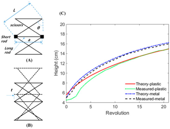 (A) Schematic diagram of a jack with original height, assuming length of the scissor is L and distance between the two short rods is a. (B) Schematic diagram of a jack after one revolution from the original height with a decrease of 1/18 in the distance between the two short rods on both sides. (C) Line chart of laboratory jack height versus number of revolution comparing real and theoretical height.