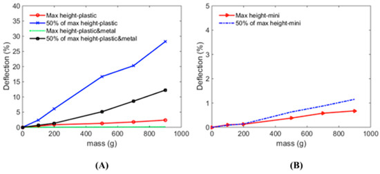 Mass versus percentage deflection for all three types of laboratory jacks. (A) Percent deflection for pure plastic and metal-plastic laboratory jacks when individual height was set at maximum and at 50% of the maximum. Plastic laboratory jacks showed close to 30% changes in height when 0.9 kg was placed on top. (B) Similar relationship for the custom-designed mini laboratory jack for the MSI. Maximum deflection was around 1% of the total height even with a load of 0.9 kg.