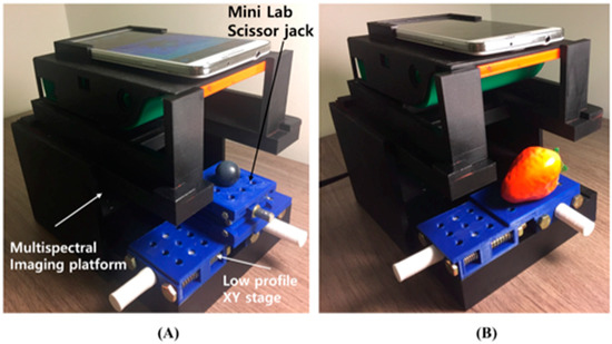 Utilizing the proposed 3-D printed XY stages and laboratory scissor jack with a portable multispectral imaging device. The system consists of a multispectral imaging platform, a low-profile XY stage for lateral sample alignment, and a mini laboratory scissor jack for vertical focusing. (A) System with combination of mini laboratory jack and low-profile XY stage. (B) System with low-profile XY stage only.