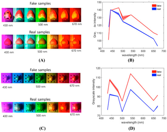A custom-designed low-profile linear stage and mini-LJ were installed on the 3-D-printed MSI device shown in Figure 8 and Figure A6 This instrument utilizes a smartphone to perform as an MSI detector while using a linear motor to sweep a color filter to generate a series of spectral reflectance images. Installing a lower-profile linear stage and mini-LJ was critical to ensure horizontal sample positioning and to account for large size differences in the objects under investigation. Since smartphone systems were configured as macro-MSI (imaging large surface area) and micro-MSI (zoom-in on a small area), a simple attachment such as the mini-LJ ensured image focus, particularly for the micro-MSI, which served as a low-power microscope. As a proof of concept, 7-color band reflection images were acquired and average grayscale intensities plotted for fake and real fruit (Figure 9). The spectral intensity plot clearly distinguishes two classes, particularly in the red color region (600–650 nm), where real fruit provides less intensity than artificially colored fruit.