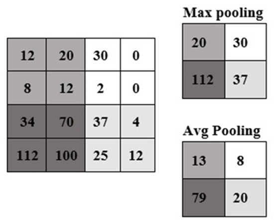 To decrease the number of parameters and network calculation, generally the pooling layer is used among convolutional layers; consequently, through the subsampling operation, input size is decreased in all depth parts and this prevents overfitting through network training. Since the spatial size of input is decreased by the pooling operation, the depth dimension is not changed. Max pooling and average pooling are the two most commonly used types of pooling operations (Figure 1). The width and height of the output in the pooling layer are achieved by Equations (3) and (4). In both equations, W1, H1, D1 are the width, height and the depth size of input respectively. S is denoted as the stride size (the step of shifting by kernels on the input image), and F is denoted as the kernel size [32].