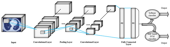 The main structures of both proposed 3D-CNN architectures, which are used for automatic feature extraction, contain six convolutional layers, four max pooling layers, and two fully connected layers. The kernel size in all convolutional layers and pooling layers is considered 3 × 3 × 3 and 2 × 2 × 2 respectively. Moreover, the number of applied kernels on feature maps in convolutional layers is 96, 128, 256, 324 and 512 respectively. For non-linearity, the Relu activation function with less computation cost is applied to the output of each convolutional layer and fully connected layers. In the first convolutional layer, 96 filters by 3 × 3 × 3 filter size are applied on the input images of 227 × 227 × 227 size. The max pooling layer is used to reduce the output size of the previous convolutional layer by applying 2 × 2 × 2 filters. Consequently, the downsampled feature maps go through the second and third convolutional layers. In order to operate downsampling on the output feature maps of the third convolutional layer, the second pooling layer is applied. Afterwards, the fourth and fifth convolutional layers are applied on the downsampled feature maps. The model continues by the rest of layers until two fully connected layers where all neurons are connected to all neurons of the previous layer. Consequently, the difference between the two 3D-CNN architectures is in their classification layers. Accordingly, in straight 3D-CNN architecture as commonplace CNN, Softmax classifier is used to classify with cancer and without cancer classes of CT scan images and, additionally, the RBF-based SVM classifier is used as a classification layer of hybrid 3D-CNN. Thus, SVM through RBF kernel can map the data to a high dimensional feature space which is considered as separable data. Furthermore, in both proposed architectures, outputs of the last fully connected layer after applying Relu activation function are fed to the classification layer as the input of classifiers. The architecture of both proposed 3D-CNNs is illustrated in Figure 4, where the classification layers are separated as two softmax and RBF-based SVM classifiers to depict both proposed architectures. Moreover, the summary of the layers is illustrated in Table 1. In addition, in this study, batch size (number of samples through one training cycle) and the learning rate of the network are determined to be 32 and 0.01, respectively, in both proposed 3D-CNN architectures. Furthermore, both proposed architectures are trained in 30 epochs as well.