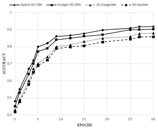 To evaluate the performance of 3D-CNN proposed architectures (straight 3D-CNN and hybrid 3D-CNN) and two 3D-AlexNet and 3D-GoogleNet architectures, 75% of the dataset is considered as a train set and 25% is considered as a test set. A summary of the accuracy rate, sensitivity, precision, and specificity of all four architectures is presented in Table 4. Moreover, the accuracy of all four architectures with epochs is depicted in Figure 5.
