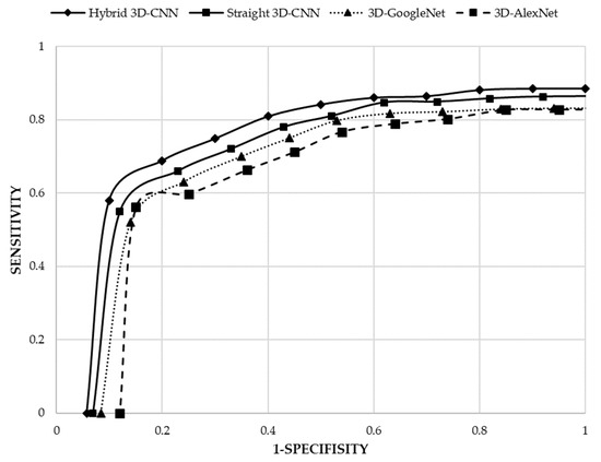 By considering the achieved results (Table 4 and Figure 5), it can be demonstrated that both proposed 3D-CNN architectures (straight 3D-CNN and hybrid 3D-CNN) have achieved a higher accuracy rate in the classification of lung CT scan images compared to the 3D-Alexnet and 3D-GoogleNet. As a result, the proposed hybrid 3D-CNN using RBF-based SVM classifier surpassed all other architectures by 91.81% accuracy rate and the second best accuracy rate belongs to the proposed straight 3D-CNN (90.23%) which used softmax classifier in the classification of lung CT scan images. However, in comparison with 3D-Alexnet having 85.79% accuracy rate, 3D-GoogleNet achieved a higher accuracy rate (87.95%). Consequently, by considering the structure of all four architectures, it will be demonstrated that more convolutional layers can help to produce more features that lead to the satisfying accuracy rate, for example, 3D-GoogleNet obtained a higher accuracy rate than 3D-AlexNet. More convolutional layers, however, can make a more complicated model to extract features. Therefore, the complex model of 3D-GoogleNet achieved a lower accuracy rate than the proposed straight 3D-CNN and hybrid 3D-CNN architectures. Hence, creating balanced CNN layers is the most significant issue in classification problems. Although 3D-GoogleNet achieved a higher sensitivity (prediction of samples with cancer) of 83.17%, specificity (prediction of samples without cancer) of 91.61% and precision (prediction of samples with cancer among all samples with the cancer label) of 88.36% compared to 3D-AlexNet (82.74% sensitivity, 88.04% specificity and 83.66% precision), the proposed two 3D-CNN architectures have obtained higher sensitivity, specificity and precision in the diagnosis of lung cancer. Therefore, according to the sensitivity, hybrid 3D-CNN using RBF-based SVM classifier and straight 3D-CNN by using softmax classifier could classify 88.53% and 86.40% samples with cancer among all samples respectively. However, 11.47% and 13.60% of samples with cancer among all samples were misclassified and are determined as without cancer samples by hybrid 3D-CNN and straight 3D-CNN as well. Furthermore, according to the specificity of both proposed architectures, only 5.77% and 6.91% of samples without cancer among all samples have been misclassified by hybrid 3D-CNN and straight 3D-CNN respectively. Both two proposed 3D-CNN architectures have surpassed the other two architectures in terms of classifying samples with cancer among all samples with the cancer label (specificity) and, additionally, hybrid 3D-CNN has obtained the highest specificity (94.23%). Figure 6 illustrates Roc curves of all four architectures based on sensitivity and 1-specificity. According to the results, it can be proved that not only did hybrid 3D-CNN by using RBF-based SVM achieve the highest results among all three architectures, but it also could acquire satisfying results by using the RBF-based SVM classifier than softmax classifier in straight 3D-CNN. Thus, the RBF-based SVM classifier could improve the performance of CNN architecture in the classification of 3D lung CT scan images.