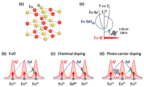 Undoped EuO is a typical Heisenberg ferromagnet with the Curie temperature TC of 69 K. The Eu2+ ions on a centrosymmetric cubic rock salt structure (Figure 2a) have strongly localized electrons with 8 as the ground state () and the saturation magnetic moment as large as arises from the spins. Due to the strong localization of the shell, the direct exchange interaction with the nearest Eu2+ neighbors is not enough to explain the TC of EuO. Instead, it has been predicted that the ferromagnetic order is driven by a virtual exchange mechanism [32]. According to this model, localized electrons are virtually excited into the empty 5d orbital and create virtual magnetic excitons, and the excited electron undergoes the intra-atomic exchange interaction with spins at the adjacent sites so that the magnetic exchange coupling can be mediated via the spatially more extended orbitals (Figure 2b). This indirect exchange interaction is considered to be stronger than the direct one. Therefore, it should be able to enhance the exchange interaction by truly populating the orbitals.