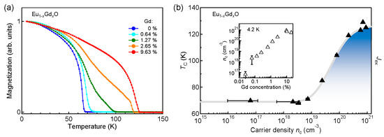 A typical way to enhance the exchange interaction is the introduction of carriers by chemical doping [31,33]. For example, by substituting a part of Eu2+ ions (Eu2+: [Xe] ) with magnetically equivalent Gd3+ ions (Gd3+: [Xe] ), spatially spread excess electrons are introduced and expected to enhance the exchange interaction (Figure 2c). Indeed, the magnetic properties of EuO drastically change by the Gd doping (Figure 3a) and it has been clarified that the increase in the carrier density due to the Gd doping leads to the increase of the exchange interaction and as a result the increase in TC (Figure 3b). Note that these dopant electrons do not form excitons, but rather occupy the Gd impurity orbitals, which in the metallic phase below TC merge with the Eu conduction band to produce a long-range RKKY contribution to .
