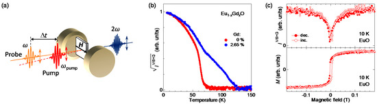 Previous experiments on undoped EuO showed that the static conductivity was increased by the irradiation of continuous laser beam [34] and the dynamic enhancement of magnetization by ultrashort laser pulses was possible as demonstrated by means of time-resolved Faraday rotation [35]. In addition, it has been reported that the spin orientation can be controlled by circularly polarized optical pulses via the inverse Faraday effect in EuO [36] and EuTe [37], and the ultrafast dynamics and modulation of the exchange interaction can be accessed using an all-optical technique in EuTe [38]. In this study, ultrafast spin dynamics after the photoexcitation were investigated in carrier-density-controlled ferromagnetic semiconductor Eu1−xGdxO films by using a pump-probe nonlinear magneto-optical spectroscopy [39,40,41,42] (Figure 4a), as described below.