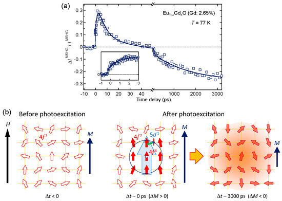 The ensuing decrease of MSHG intensity on the ns timescale is associated with the demagnetization () by the heating of the spin system through the transfer of the optical excitation energy from the electron system to the lattice and the spins (right panel in Figure 5b). The observed slow relaxation is consistent with the empirical thermal demagnetization time [53] inferred from the magnetocrystalline anisotropy constant of EuO [54], and the decrease of the MSHG intensity is consistent with the laser-pulse heating calculated from the absorption coefficient and the heat capacity of EuO [55].