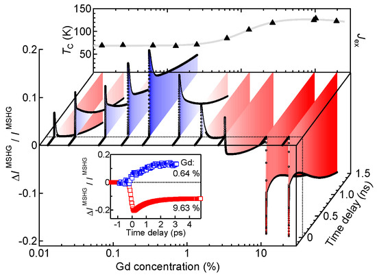 Figure 6 shows the time evolution of the photoinduced changes of the MSHG intensity at 10 K for Gd concentrations between and . The excitation density of the pump pulse is ~130 μJ/cm2 for all traces, which roughly corresponds to carriers excited by photoexcitation. A common behavior observed for all samples is the decreasing MSHG intensity on a ns timescale. As mentioned above, this is caused by the thermal destabilization of the magnetic order mediated by the spin-lattice relaxation. A prolonged positive signal (), especially observed for , is related to the stability of photoenhanced ferromagnetic state, as described below. The MSHG response on the ps timescale strongly depends on the Gd concentration. At the lowest doping (), an ultrafast increase of the MSHG signal is observed. It nicely confirms that our nonlinear magneto-optical probe reflects a variation of rather than that of the already saturated magnetization. By increasing the Gd concentration, the magnitude of this initial increase becomes progressively more pronounced and reaches a maximum near . Higher Gd doping reduces the magnitude of the initial enhancement, and at an ultrafast decrease of the MSHG signal is observed.