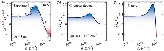 On the other hand, as shown in Figure 7b, it does not explain the photoinduced decrease of the MSHG intensity in the region where the carrier density is sufficiently high (). In the picture of the 3TM, the optical pump pulse would, in addition to exciting the localized electrons and creating the magnetic excitons, lead to the excitation of the chemically doped carriers in the conduction band and to their thermalization at the elevated temperature corresponding to the deposited energy. This would invariably reduce since the ferromagnetic coupling with electrons in the energetically higher band states becomes weaker because of their increased wavenumber. Furthermore, the increased temperature would directly contribute to the demagnetization.