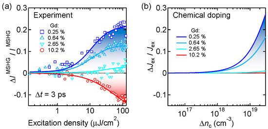 Finally, I will show the continuous tuning of the exchange interaction is possible by changing the excitation density of the pump pulse. Figure 8a shows the excitation density dependence of the change of the MSHG intensity at and at 10 K for selected Gd concentrations. Apart from the result for , where the decrease of due to the ultrafast demagnetization is observed, the overall tendencies are roughly consistent with those of plotted in Figure 8b as a function of the additional carrier density . Here, the dependence of was calculated by increasing the equilibrium carrier density of the band for each Gd concentration. The largest enhancement of is seen for because is very sensitive to the change of in this doping region. This result corroborates the above discussion and provides a possibility to control the exchange interaction on the sub-ps timescale in a well-controlled way.