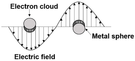 The interaction between the surface of the metal nanoparticle and the electromagnetic field that results in strong oscillations/damping is known as LSPPs. The propagation of SPs in the LSPPs is similar to the SPPs. In LSPPs, the collective oscillations of the free electron cloud are shown in Figure 3. The light scatters from a topological defect on the surface of the metallic particles or nanostructures [38,39]. In contrast with the SPPs, in which the coupling occurs at the surface of the metal layer, the collective oscillations of the free electron cloud in LSPPs are confined in metal nanoparticles or nanostructures [40].