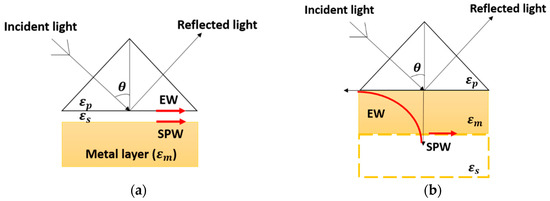 The Kretschmann configuration [44] is commonly used in most SPR applications nowadays, as shown in Figure 4a, and was developed and improved from the Otto configuration [12] shown in Figure 4b. In the Otto configuration, an air gap layer (dielectric constant, ) lies between the prism (dielectric constant, ) and the metal layer (dielectric constant, ). The evanescent wave at the prism‒air interface can excite the SPs at the air‒metal interface. Total internal reflection takes place inside the prism when the electromagnetic field propagates from the prism (high refractive index, ) to the air gap layer (low refractive index, ).