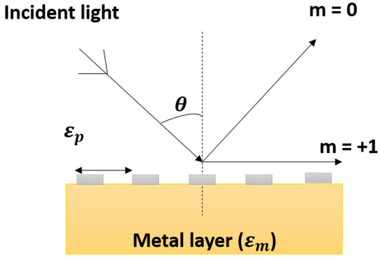 The in-plane wave vector of the incident electromagnetic field on the metal‒dielectric interface is increased to match the associated surface plasmons by a diffraction grating, as shown in Figure 5. The x-component of wave vector of the incident light, , is increased by through the order of the diffraction order, = +1 to match that of the surface plasmons [45].